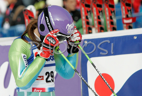 : Tina Maze of Slovenia reacts in finish of first run of Women giant slalom Audi FIS Ski World Cup 2008-09 opening race. First race of Women Audi FIS Ski World Cup season 2008-09 was held on Saturday, 25th of October 2008 in Soelden, Austria.