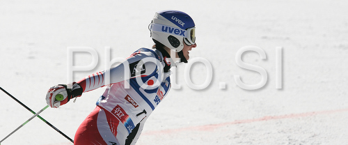 : Winner Kathrin Zettel of Austria reacts in finish of second run of Women giant slalom Audi FIS Ski World Cup 2008-09 opening race. First race of Women Audi FIS Ski World Cup season 2008-09 was held on Saturday, 25th of October 2008 in Soelden, Austria.
