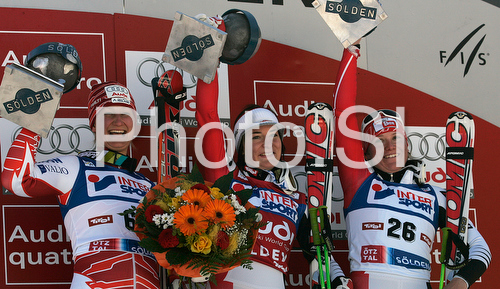 : Winner Kathrin Zettel of Austria (M), second placed Tanja Poutiainen of Finland (L) and third placed Andrea Fischbacher of Austria (R) celebrates their medals won in Women giant slalom Audi FIS Ski World Cup 2008-09 opening race. First race of Women Audi FIS Ski World Cup season 2008-09 was held on Saturday, 25th of October 2008 in Soelden, Austria.