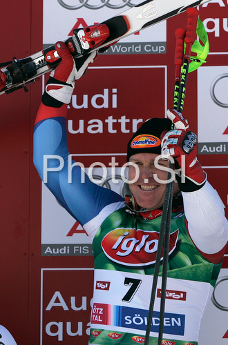 : Second placed Didier Cuche of Switzerland celebrates his medal won in Men giant slalom Audi FIS Ski World Cup 2008-09 opening race. First race of Men Audi FIS Ski World Cup season 2008-09 was held on Sunday, 26th of October 2008 in Soelden, Austria.