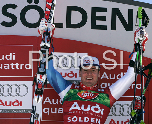 : Winner Daniel Albrecht of Switzerland celebrates his medal won in Men giant slalom Audi FIS Ski World Cup 2008-09 opening race. First race of Men Audi FIS Ski World Cup season 2008-09 was held on Sunday, 26th of October 2008 in Soelden, Austria.