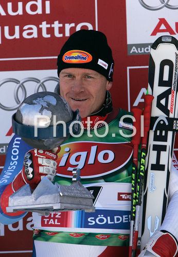 : Second placed Didier Cuche of Switzerland celebrates his medal won in Men giant slalom Audi FIS Ski World Cup 2008-09 opening race. First race of Men Audi FIS Ski World Cup season 2008-09 was held on Sunday, 26th of October 2008 in Soelden, Austria.