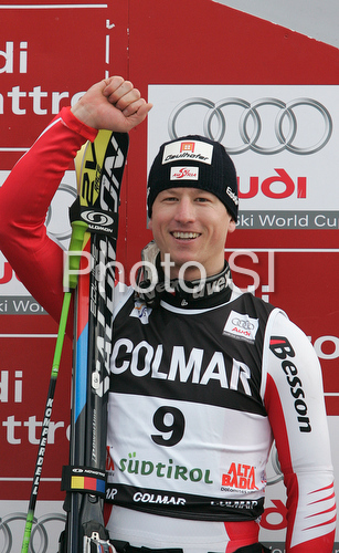 : Third placed Hannes Reichelt of Austria celebrates his medal won in Alta Badia Men giant slalom race of Audi FIS Ski World Cup 2008-09. Giant slalom race of Men Audi FIS Ski World Cup 2008-09 was traditionally held on Gran Risa course in Alta Badia, Italy, on Sunday, 21st of December 2008.