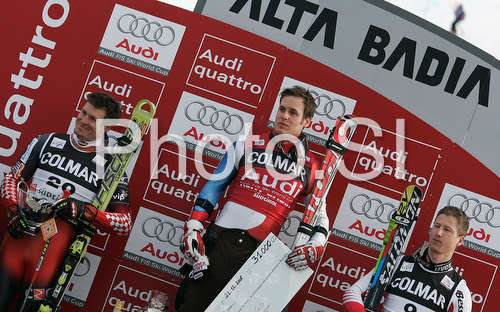 : Winner Daniel Albrecht of Switzerland (M), second placed Ivica Kostelic of Croatia (L) and third placed Hannes Reichelt of Austria (R) celebrate their medals won in Alta Badia Men giant slalom race of Audi FIS Ski World Cup 2008-09. Giant slalom race of Men Audi FIS Ski World Cup 2008-09 was traditionally held on Gran Risa course in Alta Badia, Italy, on Sunday, 21st of December 2008.