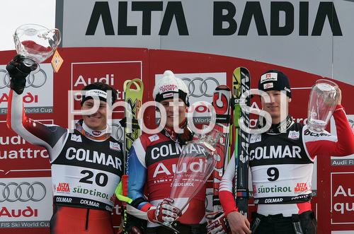 : Winner Daniel Albrecht of Switzerland (M), second placed Ivica Kostelic of Croatia (L) and third placed Hannes Reichelt of Austria (R) celebrate their medals won in Alta Badia Men giant slalom race of Audi FIS Ski World Cup 2008-09. Giant slalom race of Men Audi FIS Ski World Cup 2008-09 was traditionally held on Gran Risa course in Alta Badia, Italy, on Sunday, 21st of December 2008.