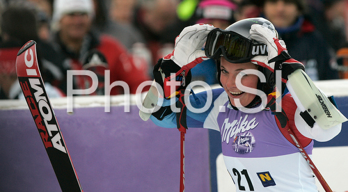 : Third placed Lara Gut of Switzerland reacts in finish of second run of Semmering women giant slalom race of Audi FIS Ski World Cup 2008-09. Giant slalom race of Women Audi FIS Ski World Cup 2008-09 was held Semmering, Austria, on Sunday, 28th of December 2008.