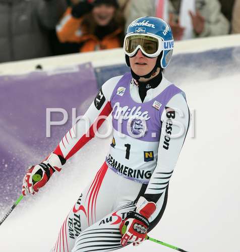 : Winner Kathrin Zettel of Austria reacts in finish of second run of Semmering women giant slalom race of Audi FIS Ski World Cup 2008-09. Giant slalom race of Women Audi FIS Ski World Cup 2008-09 was held Semmering, Austria, on Sunday, 28th of December 2008.