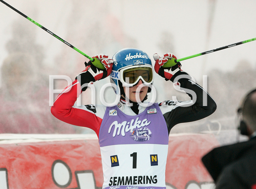 : Winner Kathrin Zettel of Austria reacts in finish of second run of Semmering women giant slalom race of Audi FIS Ski World Cup 2008-09. Giant slalom race of Women Audi FIS Ski World Cup 2008-09 was held Semmering, Austria, on Sunday, 28th of December 2008.