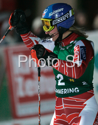 : Second placed Tanja Poutiainen of Finland reacts in finish of second run of Semmering women slalom race of Audi FIS Ski World Cup 2008-09. Slalom race of Women Audi FIS Ski World Cup 2008-09 was held Semmering, Austria, on Monday, 29th of December 2008.