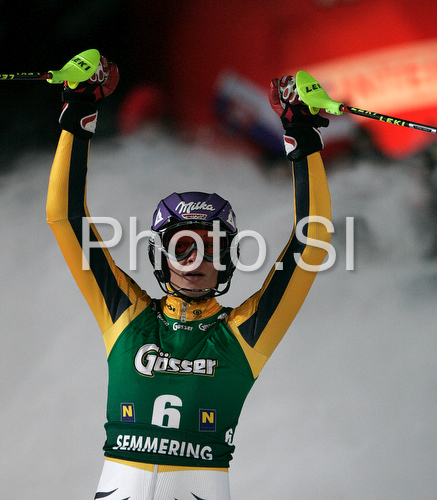 : Winner Maria Riesch of Germany reacts in finish of second run of Semmering women slalom race of Audi FIS Ski World Cup 2008-09. Slalom race of Women Audi FIS Ski World Cup 2008-09 was held Semmering, Austria, on Monday, 29th of December 2008.