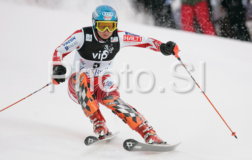 : Sixth placed after first run Tanja Poutiainen of Finland skiing in first run of Zagreb women slalom race of Audi FIS Ski World Cup 2008-09. Slalom race of Women Audi FIS Ski World Cup 2008-09 was held Zagreb, Croatia, on Sunday, 4th of January 2009.