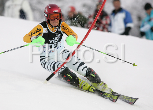 : Kathrin Hoelzl of Germany skiing in first run of Zagreb women slalom race of Audi FIS Ski World Cup 2008-09. Slalom race of Women Audi FIS Ski World Cup 2008-09 was held Zagreb, Croatia, on Sunday, 4th of January 2009.