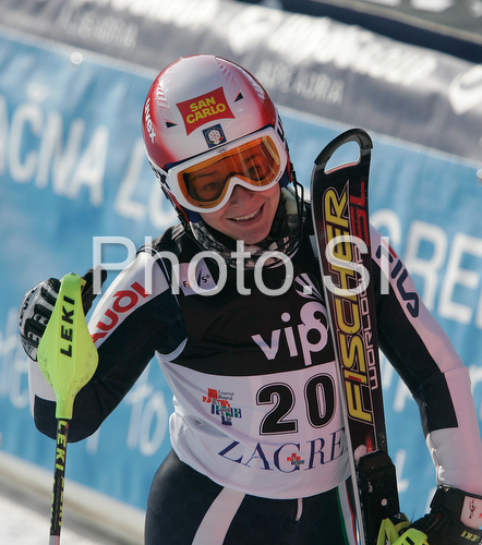 : Second placed Nicole Gius of Italy reacts in finish of second run of Zagreb women slalom race of Audi FIS Ski World Cup 2008-09. Slalom race of Women Audi FIS Ski World Cup 2008-09 was held Zagreb, Croatia, on Sunday, 4th of January 2009.