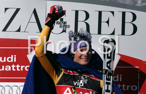 : Winner Maria Riesch of Germany celebrates her medal won in Zagreb women slalom race of Audi FIS Ski World Cup 2008-09. Slalom race of Women Audi FIS Ski World Cup 2008-09 was held Zagreb, Croatia, on Sunday, 4th of January 2009.