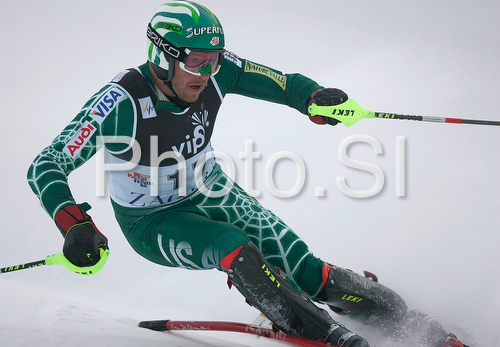 : Bode Miller of USA skiing in first run of Zagreb men slalom race of Audi FIS Ski World Cup 2008-09. Slalom race of Men Audi FIS Ski World Cup 2008-09 was held on Sljeme above Zagreb, Croatia, on Tuesday, 6th of January 2009.