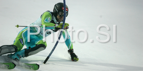 : Mitja Valencic of Slovenia skiing in first run of Zagreb men slalom race of Audi FIS Ski World Cup 2008-09. Slalom race of Men Audi FIS Ski World Cup 2008-09 was held on Sljeme above Zagreb, Croatia, on Tuesday, 6th of January 2009.