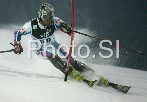 : Thomas Fanara of France skiing in first run of Zagreb men slalom race of Audi FIS Ski World Cup 2008-09. Slalom race of Men Audi FIS Ski World Cup 2008-09 was held on Sljeme above Zagreb, Croatia, on Tuesday, 6th of January 2009.