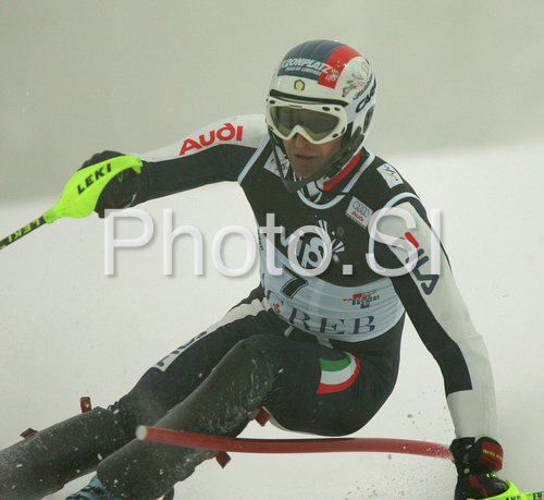 : Manfred Moelgg of Italy skiing in first run of Zagreb men slalom race of Audi FIS Ski World Cup 2008-09. Slalom race of Men Audi FIS Ski World Cup 2008-09 was held on Sljeme above Zagreb, Croatia, on Tuesday, 6th of January 2009.