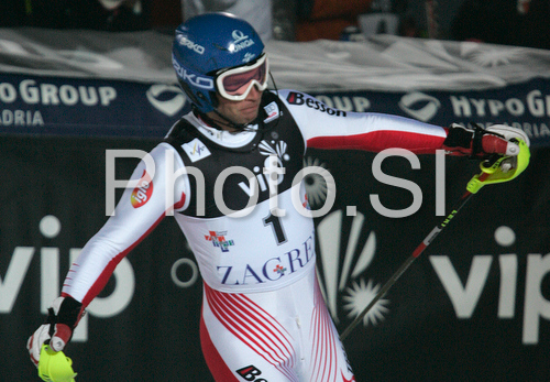 : Sixth placed Benjamin Raich of Austria reacts in finish of second run of Zagreb men slalom race of Audi FIS Ski World Cup 2008-09. Slalom race of Men Audi FIS Ski World Cup 2008-09 was held on Sljeme above Zagreb, Croatia, on Tuesday, 6th of January 2009.