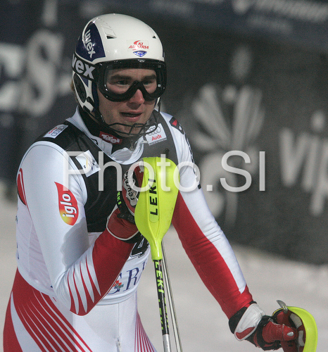 : Tenth placed Patrick Bechter of Austria reacts in finish of second run of Zagreb men slalom race of Audi FIS Ski World Cup 2008-09. Slalom race of Men Audi FIS Ski World Cup 2008-09 was held on Sljeme above Zagreb, Croatia, on Tuesday, 6th of January 2009.