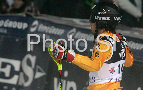 : Felix Neureuther of Germany reacts in finish of second run of Zagreb men slalom race of Audi FIS Ski World Cup 2008-09. Slalom race of Men Audi FIS Ski World Cup 2008-09 was held on Sljeme above Zagreb, Croatia, on Tuesday, 6th of January 2009.