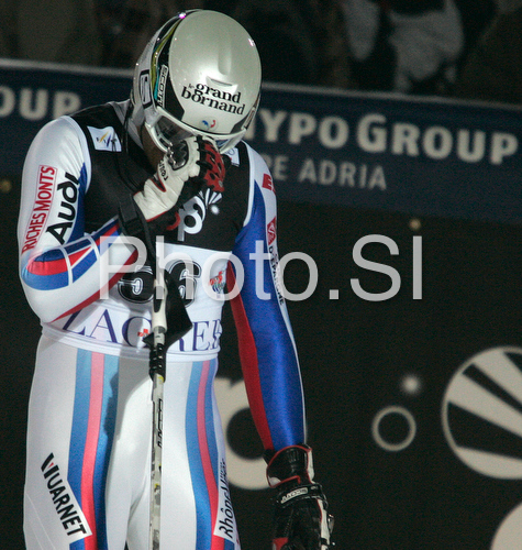 : Thomas Mermillod Blondin of France reacts in finish of second run of Zagreb men slalom race of Audi FIS Ski World Cup 2008-09. Slalom race of Men Audi FIS Ski World Cup 2008-09 was held on Sljeme above Zagreb, Croatia, on Tuesday, 6th of January 2009.