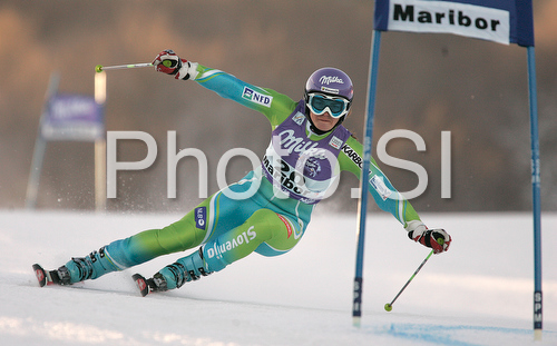 : Second placed after first run Tina Maze of Slovenia skiing in first run of Maribor women giant slalom race of Audi FIS Ski World Cup 2008-09. Giant slalom race of Women Audi FIS Ski World Cup 2008-09 was held in Maribor, Slovenia on Saturday, 10th of January 2009.