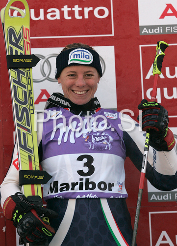 : Second placed Denise Karbon of Italy celebrates her medal won in Maribor women giant slalom race of Audi FIS Ski World Cup 2008-09. Giant slalom race of Women Audi FIS Ski World Cup 2008-09 was held in Maribor, Slovenia on Saturday, 10th of January 2009.
