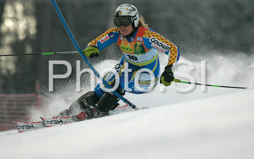 : Fifth placed Anja Paerson of Sweden skiing in first run of Maribor women slalom race of Audi FIS Ski World Cup 2008-09. Slalom race of Women Audi FIS Ski World Cup 2008-09 was held in Maribor, Slovenia on Sunday, 11th of January 2009.