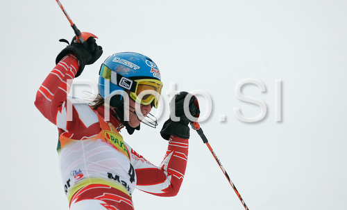 : Third placed Tanja Poutiainen of Finland reacts in finish of second run of Maribor women slalom race of Audi FIS Ski World Cup 2008-09. Slalom race of Women Audi FIS Ski World Cup 2008-09 was held in Maribor, Slovenia on Sunday, 11th of January 2009.