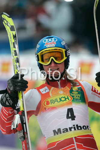 : Third placed Tanja Poutiainen of Finland reacts in finish of second run of Maribor women slalom race of Audi FIS Ski World Cup 2008-09. Slalom race of Women Audi FIS Ski World Cup 2008-09 was held in Maribor, Slovenia on Sunday, 11th of January 2009.