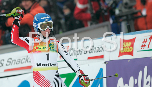 : Second placed Kathrin Zettel of Austria reacts in finish of second run of Maribor women slalom race of Audi FIS Ski World Cup 2008-09. Slalom race of Women Audi FIS Ski World Cup 2008-09 was held in Maribor, Slovenia on Sunday, 11th of January 2009.