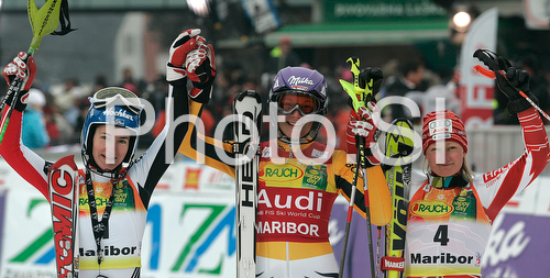 Maribor ,Slovenia - 11.01.2009 : Winner Maria Riesch of Germany (M), second placed Kathrin Zettel of Austria (L) and third placed Tanja Poutiainen of Finland (R) celebrate their medals won in of Maribor women slalom race of Audi FIS Ski World Cup 2008-09. Slalom race of Women Audi FIS Ski World Cup 2008-09 was held in Maribor, Slovenia on Sunday, 11th of January 2009. Photo by: Primoz Jeroncic