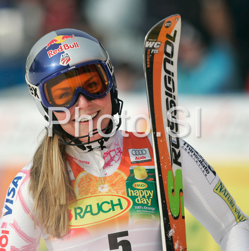 : Fourth placed Lindsey Vonn of USA reacts in finish of second run of Maribor women slalom race of Audi FIS Ski World Cup 2008-09. Slalom race of Women Audi FIS Ski World Cup 2008-09 was held in Maribor, Slovenia on Sunday, 11th of January 2009.