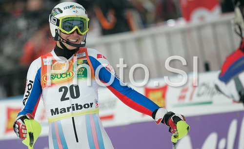 : Eight placed Sandrine Aubert of France reacts in finish of second run of Maribor women slalom race of Audi FIS Ski World Cup 2008-09. Slalom race of Women Audi FIS Ski World Cup 2008-09 was held in Maribor, Slovenia on Sunday, 11th of January 2009.
