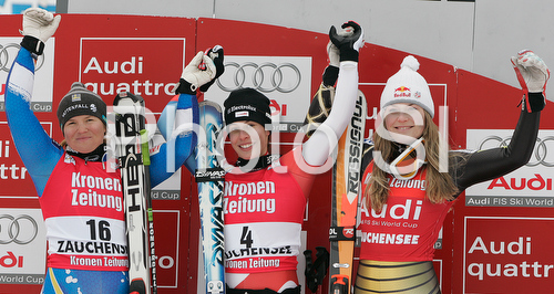 : Winners Anja Paerson of Sweden (L) and Dominique Gisin of Switzerland (M) and third placed Lindsey Vonn of USA (R) celebrates their medals won in Women downhill race of Zauchenee Audi FIS Ski World Cup 2008-09. Downhill race of Women Audi FIS Ski World Cup 2008-09 was held in Zauchensee, Austria on Sunday, 18th of January 2009.