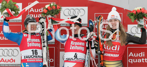 Zauchensee ,Austria - 18.01.2009 : Winners Anja Paerson of Sweden (L) and Dominique Gisin of Switzerland (M) and third placed Lindsey Vonn of USA (R) celebrates their medals won in Women downhill race of Zauchenee Audi FIS Ski World Cup 2008-09. Downhill race of Women Audi FIS Ski World Cup 2008-09 was held in Zauchensee, Austria on Sunday, 18th of January 2009. Photo by: Tomaz Jeroncic