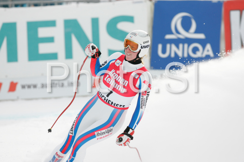 : Aurelie Revillet of France reacts in finish of Women downhill race of Zauchenee Audi FIS Ski World Cup 2008-09. Downhill race of Women Audi FIS Ski World Cup 2008-09 was held in Zauchensee, Austria on Sunday, 18th of January 2009.
