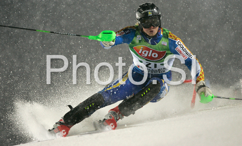 : Jens Byggmark of Sweden skiing in first run of Men slalom race of Schladming Audi FIS Ski World Cup 2008-09. Schladming slalom Nightrace of Men Audi FIS Ski World Cup 2008-09 was held in Schladming, Austria on Sunday, 27th of January 2009.