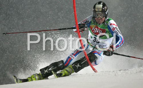 : Alexandre Anselmet of France skiing in first run of Men slalom race of Schladming Audi FIS Ski World Cup 2008-09. Schladming slalom Nightrace of Men Audi FIS Ski World Cup 2008-09 was held in Schladming, Austria on Sunday, 27th of January 2009.