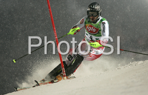 : Leader after first run Reinfried Herbst of Austria skiing in first run of Men slalom race of Schladming Audi FIS Ski World Cup 2008-09. Schladming slalom Nightrace of Men Audi FIS Ski World Cup 2008-09 was held in Schladming, Austria on Sunday, 27th of January 2009.