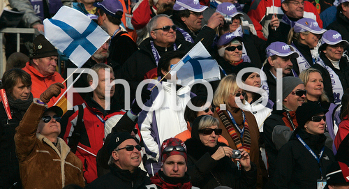 : Finnish supporters in finish of second run of Women slalom race of Garmisch-Partenkirchen Audi FIS Ski World Cup 2008-09. Garmisch-Partenkirchen slalom Women Audi FIS Ski World Cup 2008-09 was held in Garmisch-Partenkirchen on Friday, 30th of January 2009.