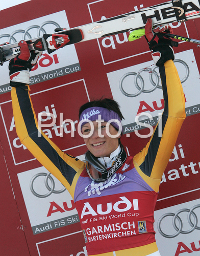 : Second placed Maria Riesch of Germany celebrates her medal won in Women slalom race of Garmisch-Partenkirchen Audi FIS Ski World Cup 2008-09. Garmisch-Partenkirchen slalom Women Audi FIS Ski World Cup 2008-09 was held in Garmisch-Partenkirchen on Friday, 30th of January 2009.