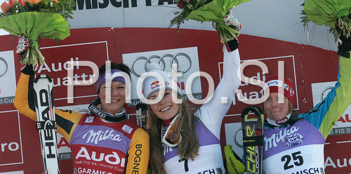 : Winner Lindsey Vonn of USA (M), second placed Maria Riesch of Germany (L) and third placed Marusa Ferk of Slovenia (R) celebrates their medals won in Women slalom race of Garmisch-Partenkirchen Audi FIS Ski World Cup 2008-09. Garmisch-Partenkirchen slalom Women Audi FIS Ski World Cup 2008-09 was held in Garmisch-Partenkirchen on Friday, 30th of January 2009.