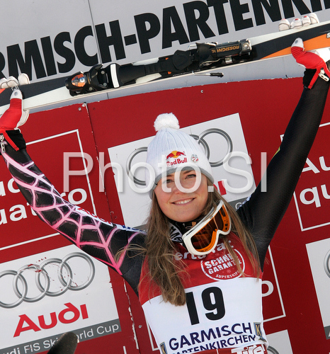 Garmisch-Partenkirchen ,Germany - 01.02.2009 : Winner Lindsey Vonn of USA celebrates her medal won in Women Super-G race of Garmisch-Partenkirchen Audi FIS Ski World Cup 2008-09. Garmisch-Partenkirchen Super-G race of Women Audi FIS Ski World Cup 2008-09 was held in Garmisch-Partenkirchen on Sunday, 1st of February 2009. Photo by: Tomaz Jeroncic