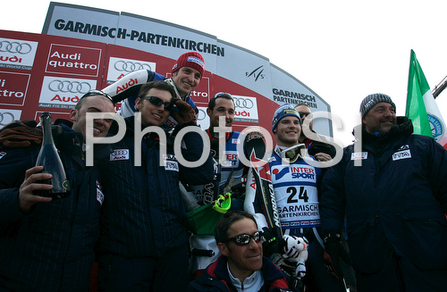 : Members of Italian team with winner Manfred Moelgg of Italy (L), second placed Giorgio Rocca of Italy (M) and eight placed Giuliano Razzoli of Italy (R) celebrate their success in Men slalom race of Garmisch-Partenkirchen Audi FIS Ski World Cup 2008-09. Garmisch-Partenkirchen slalom Men Audi FIS Ski World Cup 2008-09 was held in Garmisch-Partenkirchen on Sunday, 1st of February 2009.