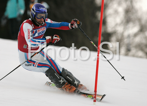 : Jean-Baptiste Grange of France skiing in first run of Men slalom race of Garmisch-Partenkirchen Audi FIS Ski World Cup 2008-09. Garmisch-Partenkirchen slalom Men Audi FIS Ski World Cup 2008-09 was held in Garmisch-Partenkirchen on Sunday, 1st of February 2009.