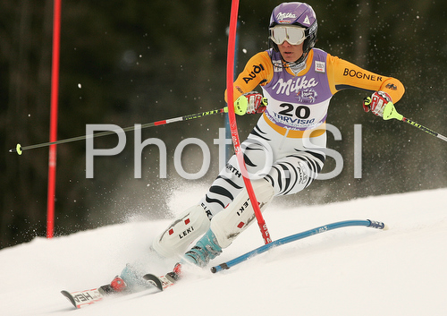 : Winner Maria Riesch of Germany skiing in slalom part of Women Super combined race of Tarvisio Audi FIS Ski World Cup 2008-09. Super combined race of Women Audi FIS Ski World Cup 2008-09 was held in Tarvisio, Italy on Friday, 20th of February 2009.