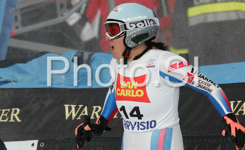 : Marie Marchand-Arvier of France reacts in finish of Women Downhill race of Tarvisio Audi FIS Ski World Cup 2008-09. Downhill race of Women Audi FIS Ski World Cup 2008-09 was held in Tarvisio, Italy on Saturdayday, 21st of February 2009.