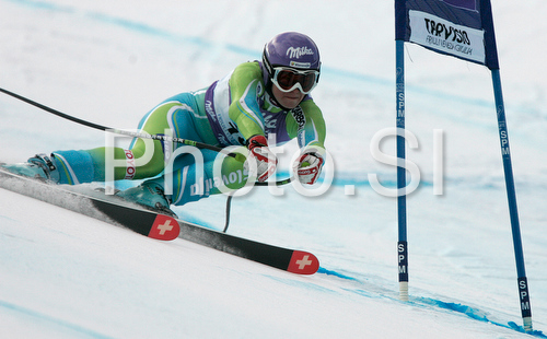 : Third placed Tina Maze of Slovenia skiing in Women Super-G race of Tarvisio Audi FIS Ski World Cup 2008-09. Downhill race of Women Audi FIS Ski World Cup 2008-09 was held in Tarvisio, Italy on Sunday, 22nd of February 2009.